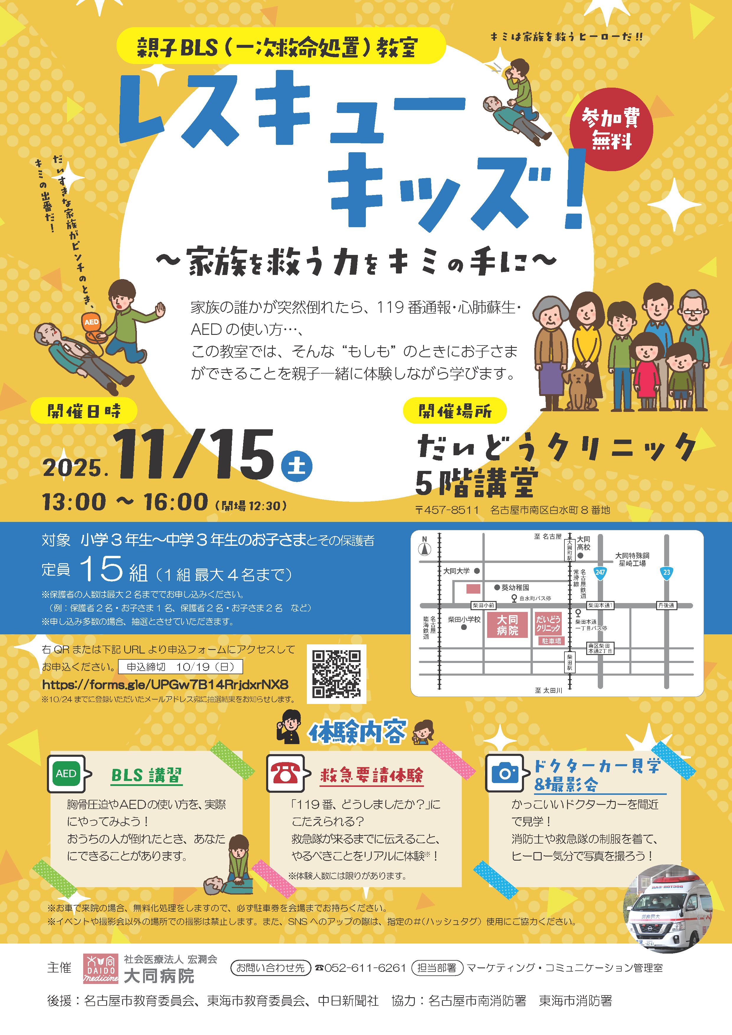 - BLS講習:胸骨圧迫(心臓マッサージ)やAEDの使い方を実際に体験します。家族が倒れたとき、救うのはキミだ!