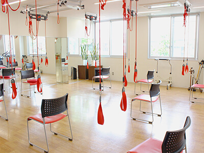 天井から下げた赤いロープで体の様々な部分を吊るして行う運動療法です。余計な負荷をかけず、安全に柔軟性向上や筋力・バランスの強化が図れます。総合的な運動で、慢性的な痛みの軽減、ケガや転倒の予防にもつながります。